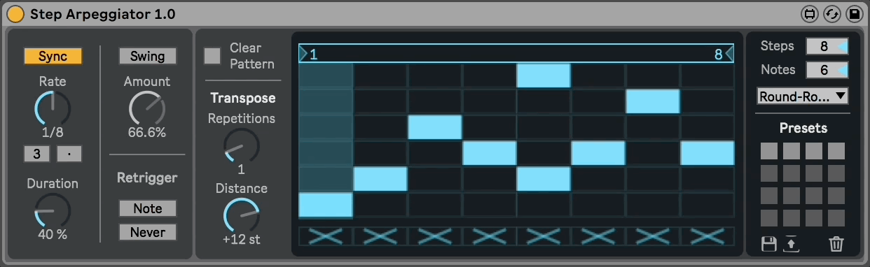 And of course, Step Arpeggiator has all the other things an arpeggiator have. Like Sync/Free Rate (with triplets and dotted notes), Duration (aka Gate) of every note, Swing on/off, Swing Amount (groove), Retrigger options, a Transpose option, etc.