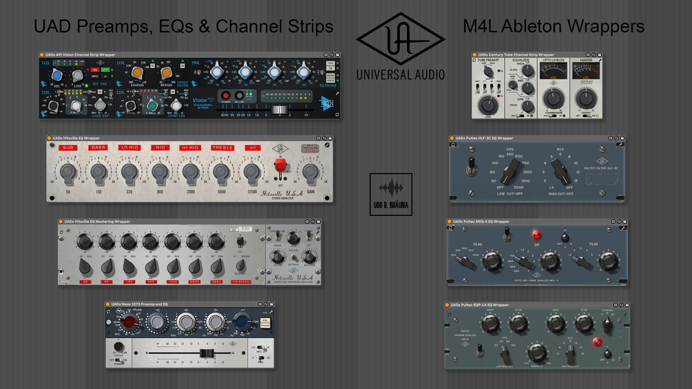 With these m4l devices you will be able to use the Universal Audio Pultec equalizers, the Universal Audio Hitsville equalizers, the Universal Audio Neve 1073 preamp and eq, the Universal Audio API Vision channel strip and the Universal Audio Century Tube channel strip like Ableton native plugins.